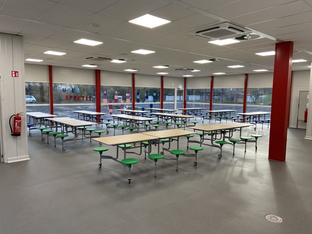 Bei einer Grundschule in Krefeld wurden wir gebeten, während des Baus einer neuen Mensa eine provisorische Einrichtung zu installieren, damit die Kinder weiterhin bequem ihr Mittagessen genießen können.